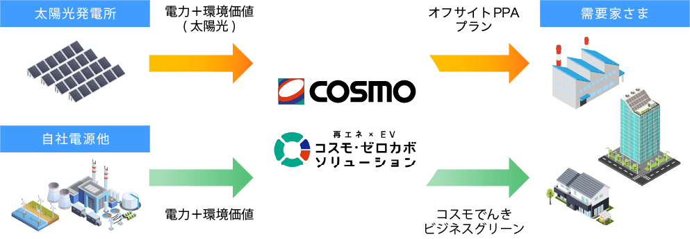 敷地外の太陽光発電所から「電力」と「環境価値」をセットで長期安定供給。さらに、コスモでんきビジネスグリーンとの組み合わせにより、施設全体を100%再エネ化します。追加性の再エネを活用しながら、価格変動リスクを抑え、お客様の脱炭素目標達成を確実にサポートします。